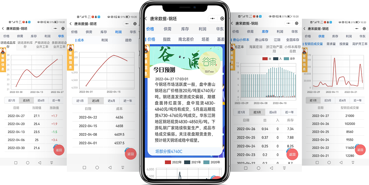手机终端,核心数据,一键成图,钢坯数据,带钢数据,焦炭数据,铁矿石数据;唐宋信息产品重要的推送手段之一,具有随身、及时、方便等特点。